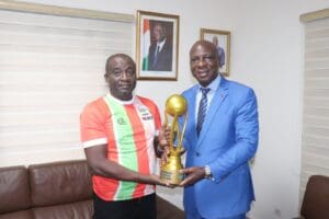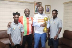 Les Eléphants du football petits poteaux sont champions d’Afrique. Le 14 décembre dernier à Korhogo, les athlètes ivoiriens ont brillamment remporté la 2e édition de la Coupe d’Afrique des Nations de Football Petits Poteaux, en disposant 1-0 de leurs homologues guinéens. Me Inza FOFANA, le Président de la Fédération Ivoirienne de Football Petits Poteaux, et quelques membres de son Comité Exécutif, accompagnés des joueurs, ont été reçus en audience en cette fin d’après-midi du vendredi 19 décembre 2025, par le Ministre BAMBA Cheick Daniel, Directeur Général de l’Agence Foncière Rurale (AFOR).