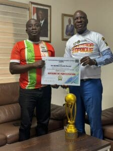 En plus du trophée présenté, le Comité Exécutif de la Fédération Ivoirienne de Football Petits Poteaux a remis un diplôme d’honneur à l’ex-Président de la Fédération Ivoirienne de Taekwondo et un tee-shirt symbolisant le sacre africain. Devant une telle marque d’attention, le Directeur Général de l’AFOR a félicité toute la délégation, pour avoir honoré le drapeau ivoirien. Il a ensuite rappelé sa longue fraternité avec Me Inza FOFANA, qui dure 37 ans.