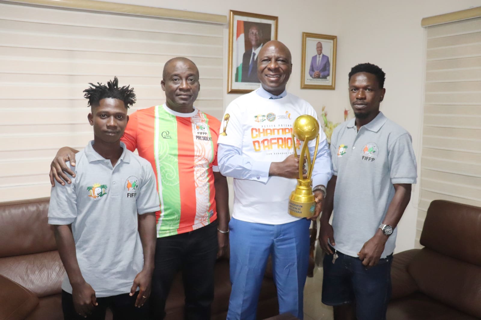Les Eléphants du football petits poteaux sont champions d’Afrique. Le 14 décembre dernier à Korhogo, les athlètes ivoiriens ont brillamment remporté la 2e édition de la Coupe d’Afrique des Nations de Football Petits Poteaux, en disposant 1-0 de leurs homologues guinéens. Me Inza FOFANA, le Président de la Fédération Ivoirienne de Football Petits Poteaux, et quelques membres de son Comité Exécutif, accompagnés des joueurs, ont été reçus en audience en cette fin d’après-midi du vendredi 19 décembre 2025, par le Ministre BAMBA Cheick Daniel, Directeur Général de l’Agence Foncière Rurale (AFOR).