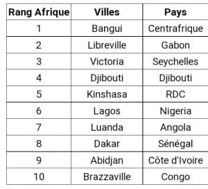 Derrière Bangui on retrouve des villes habituées aux mauvaises places dans ce classement africain, comme Libreville (Gabon) au 23e rang mondial, suivie de Victoria (Seychelles) au 38e rang mondial, de Djibouti (Djibouti) au 41e rang mondial et Kinshasa (RD Congo) au 53e rang mondial.